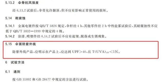 根据我国国家标准GB/T23147-2018《晴雨伞》规定,UPF>40且T(UVA)AV。T(UVA)AV是日光紫外线UVA透射比的平均值,反映防晒遮挡效果;该值越小,表明透射量越小。因此,UPF值越高越好,T(UVA)AV值则越低越好。
